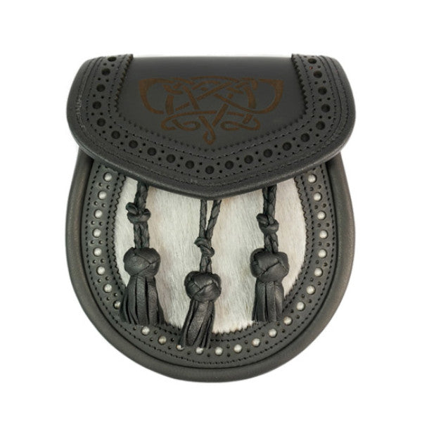 This semi formal Sporran features a hide front panel framed by brogued leather. Hand braided rope tassels compliment the design.