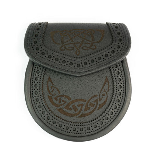 A Robust Day Sporran Engraved with traditional Celtic art work framed by brogued leather on both the body and flap.