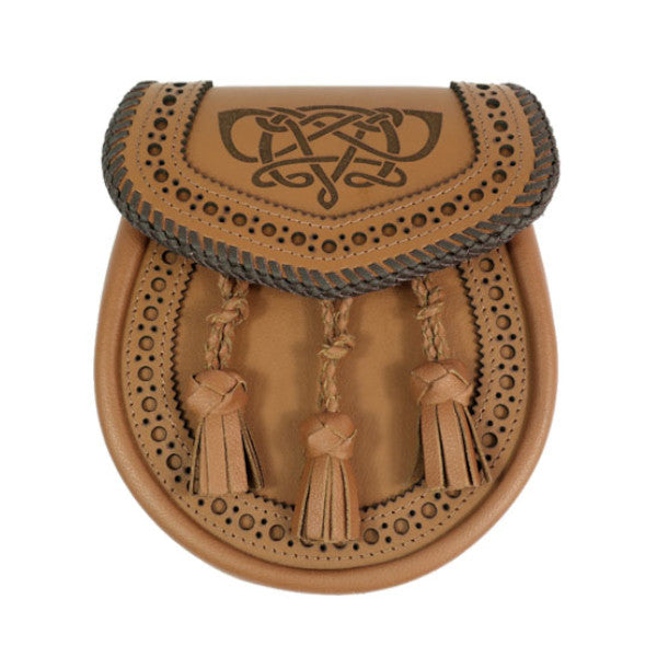 Bringing together several elements of traditional sporran making, hand binding, Celtic engraving , Brogued leather and hand pleated rope tassels make this a real statement Sporran.