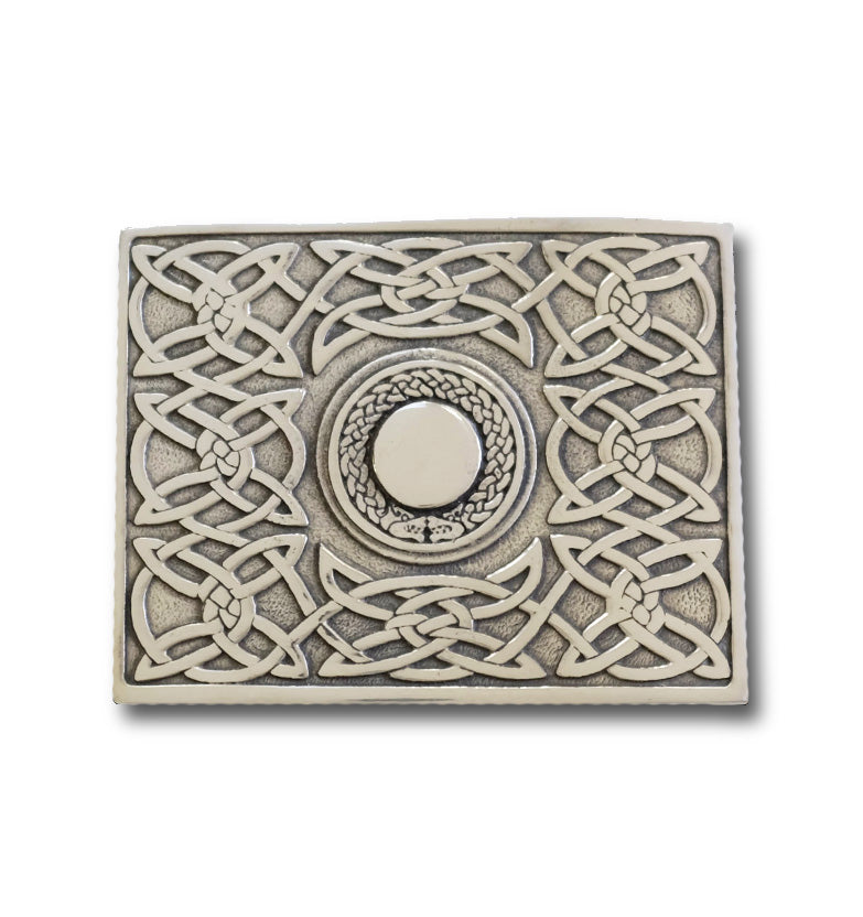 Kilt belt buckle to fit standard 2 1.4” width belt. Cast in pewter and mounted with traditional celtic weave and torq design.