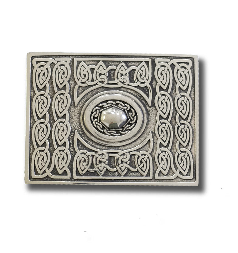 Kilt belt buckle to fit standard 2 1.4” width belt. Cast in pewter and mounted with traditional celtic weave and oval design.