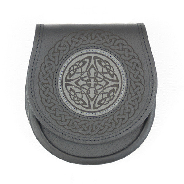 An all leather Highland sporran featuring an ornate Celtic design on the large front flap.