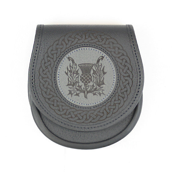 An all leather Highland sporran featuring an ornate Scottish Thistle design on the large front flap.