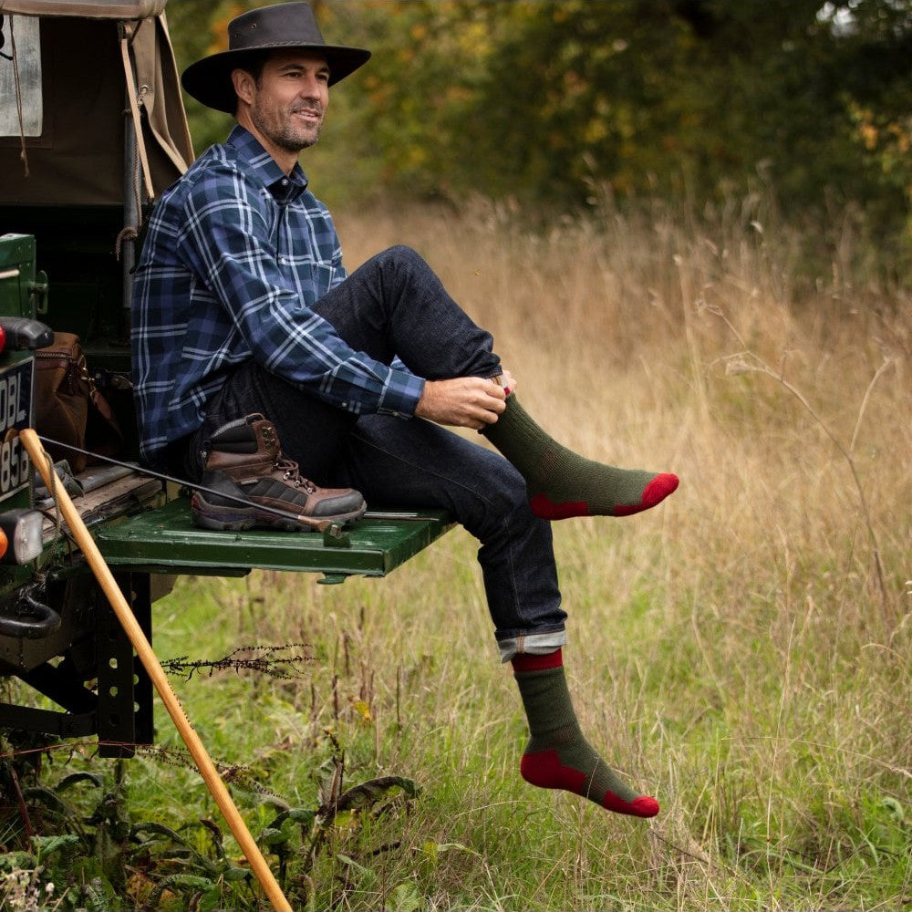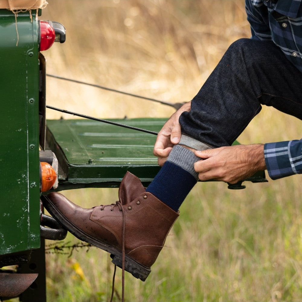 Merino wool blend walking and fishing socks. Cushioned foot socks featuring a soft fit cuff, ribs for ventilation and lycra support at the ankle and instep. Knitted and hand finished in Scotland.