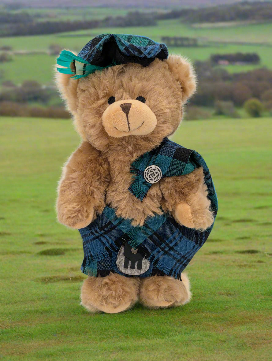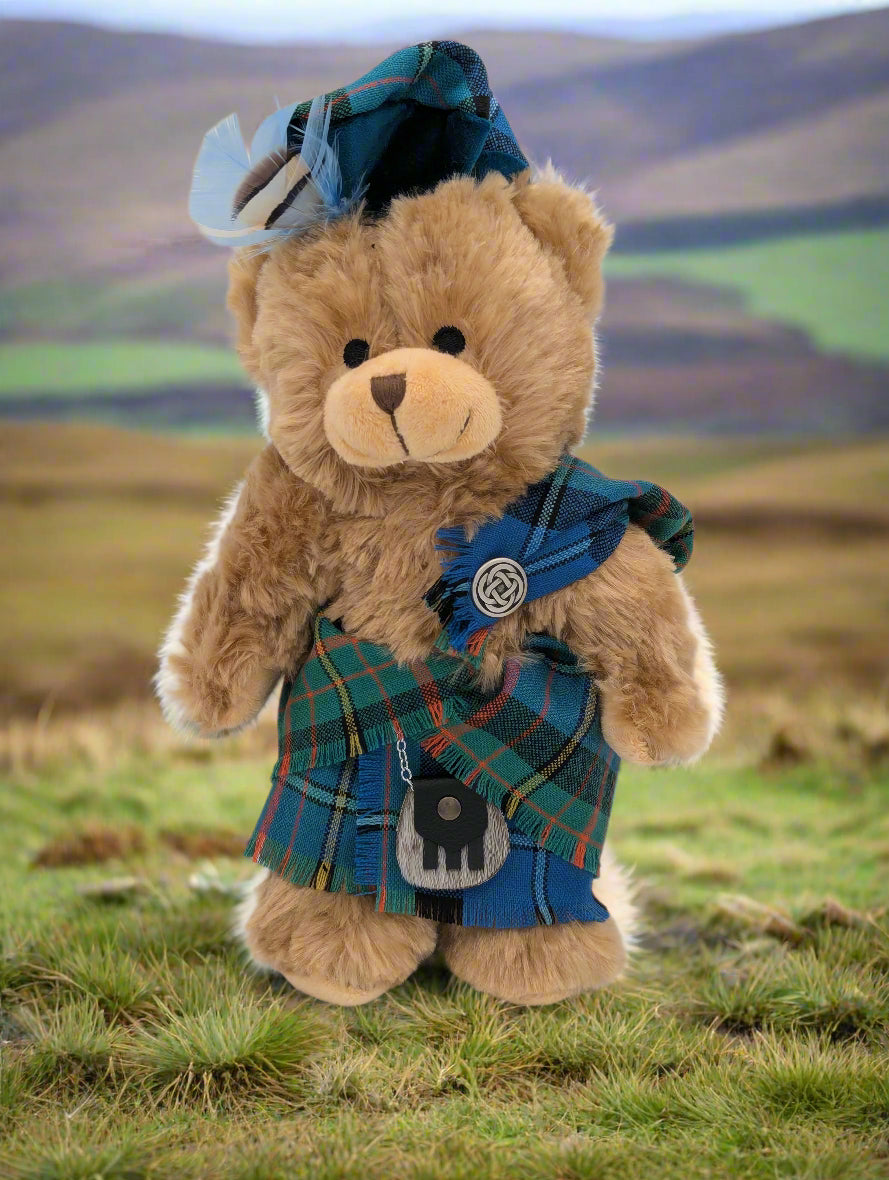 11" tall highland bear, outfitted with tartan tam and kilt. With posable arms and legs.