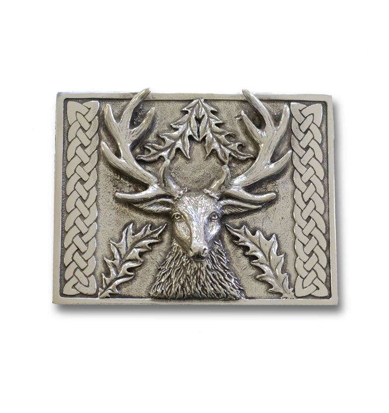 Kilt belt buckle to fit standard 2 1.4” width belt. Cast in pewter and mounted with traditional Stag head and celtic weave design.